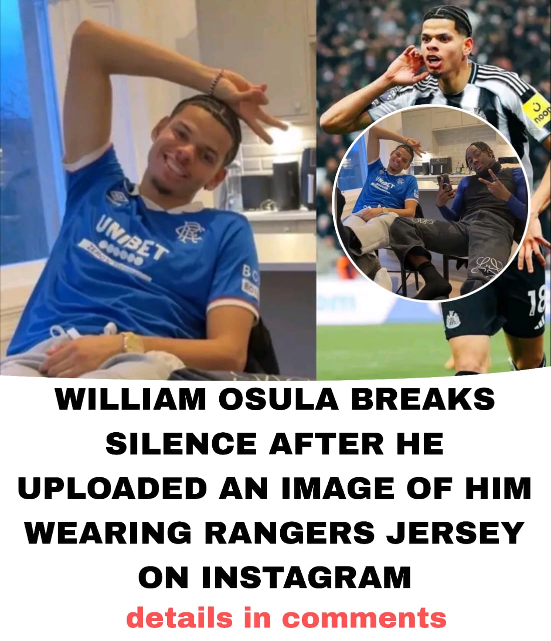 Newcastle United forward William Osula has moved to clarify his future after posting an image of himself wearing a Rangers FC jersey on Instagram — a moment that quickly triggered speculation about a potential move to Scotland.