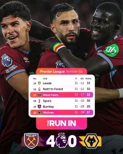 To their credit, West Ham United were outstanding in attack. Their movement, intensity, and finishing were a level above their opponents, leaving Wolves with little chance to respond. The win not only lifted spirits but also provided a crucial boost in their fight to avoid relegation from the Premier League.